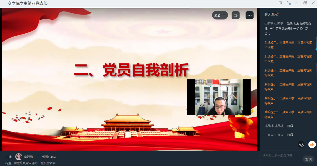 为庆祝中国共产党百年华诞,深入学习习近平总书记的重要讲话精神和习近平新时代中国特色社会主义思想。同时,为了加强支部成员内部联系,6165金沙总站学生第八党支部于2021年8月31日星期二下午通过线上会议的方式召开七一组织生活会,支部书记李焕和学生第八党支部全体党员参与会议,会议由李若男主持。